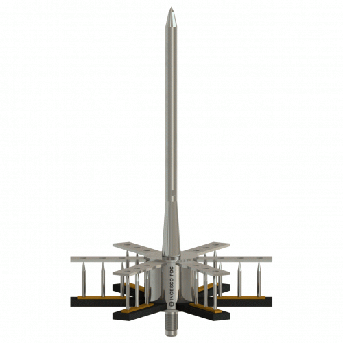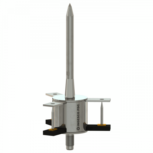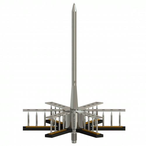 قضبان مانعة صواعق بنظام ESE (Early Streamer Emission) من INGESCO® لتأمين الحماية الخارجية للمباني والمساحات المفتوحة. تصميم غير إلكتروني بدون بطاريات أو تغذية، لا يحتاج صيانة مع جسم من ستانلس ستيل AISI 316L، وتحمل تيار صاعقة حتى 200kA.